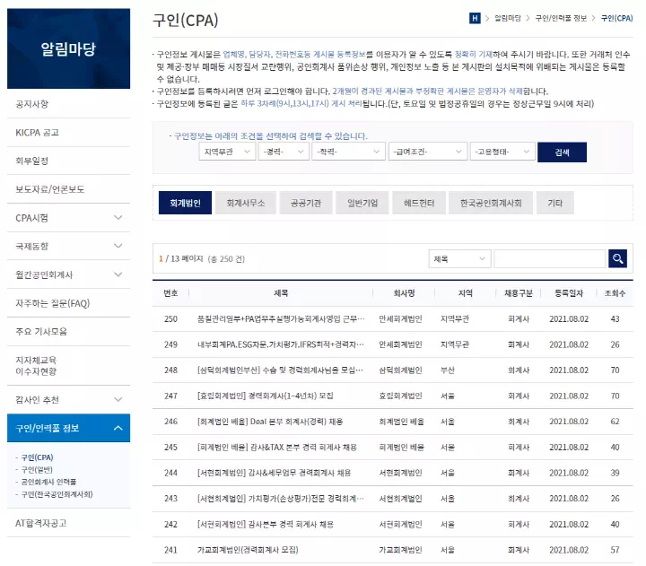 회계법인은 타 법인 이직, 퇴사 등이 자유롭게 이루어지는 곳이므로 입사를 확정지었더라도 중간에 나가는 경우도 많으며 기존 팀의 인원이 나가는 경우도 많습니다. 따라서 중간에 회계사들이 나가게 되면 다른 회계사로 채워야 하는데 이런 결원에 대한 보충은 지인을 통해 알음알음 뽑기도 하지만 한국공인회계사회를 통해서 공고를 올리고 모집하는 경우도 종종 있습니다.